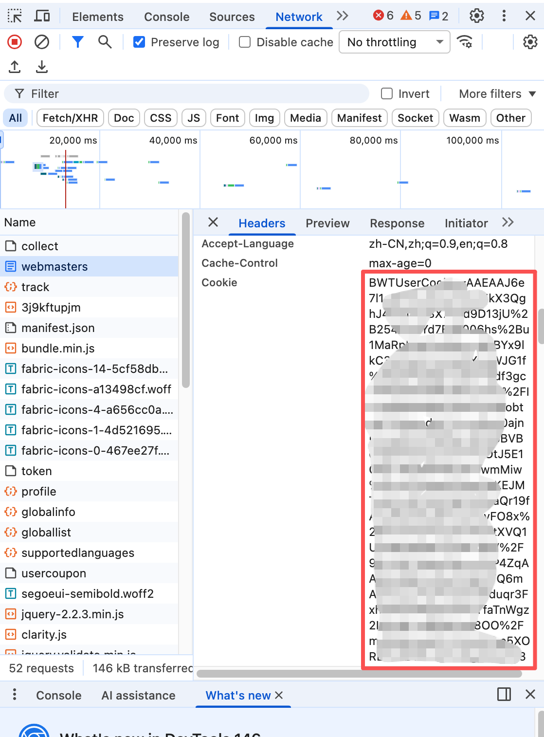 1、谷歌浏览器,右键选择 检查 2、选择network网络,如果下面没有内容则刷新下页面就行 3、下拉找到cookie,双击红框部分可以复制到粘贴板 上一页 文章 2025最强大的WordPress网站搬家(搬迁)备份软件